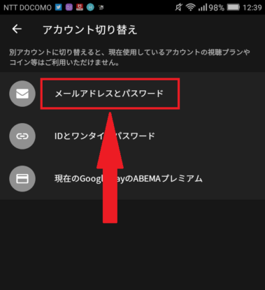 の3種類からアカウント切り替えができますが、ここでは「メールアドレスとパスワード」を選択します。