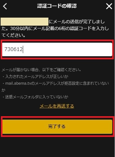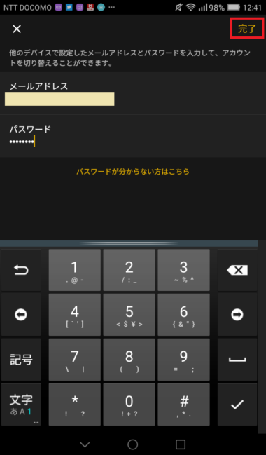 登録したメールアドレスとパスワードを入力し、右上の「完了」をクリックすれば、ABEMAプレミアムのアカウントに切り替わります。