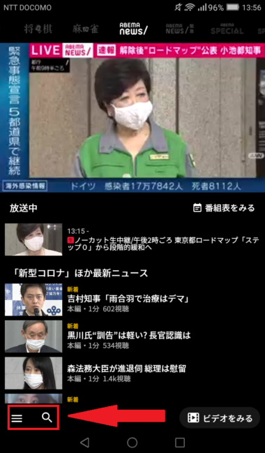 あとはアプリの右下のメニューボタンや検索ボタンで見たい番組や動画を検索して楽しみましょう。