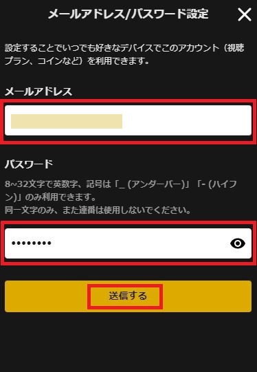 この画面ではアカウント作成用のメールアドレスとパスワードを入力し、送信するをクリックします。