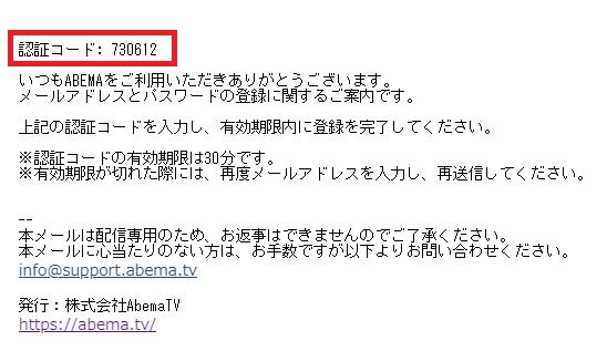 すると登録したメールアドレスにこのような認証コードを知らせるメールが届きます。