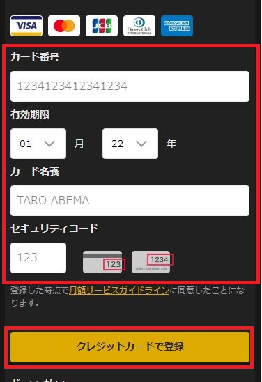 「クレジットカード」をタップすると、カード番号などを入力する画面が表示されるので、必要事項を記入し、最後に「クレジットカードで登録」をクリック。
