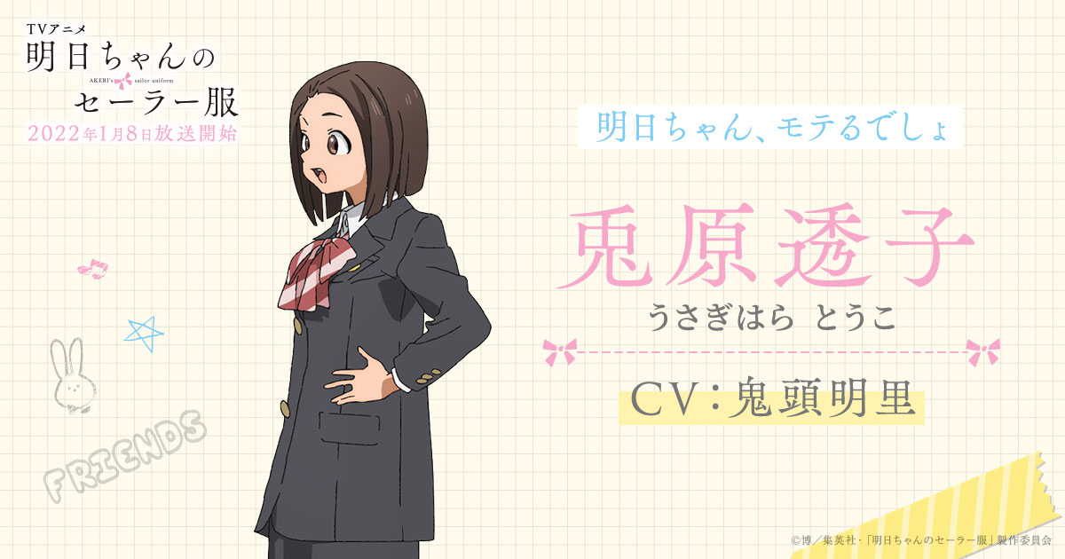 兎原透子 - 登場人物 | TVアニメ「明日ちゃんのセーラー服」公式サイト【2022.1.8 ON AIR】TVアニメ「明日ちゃんのセーラー服」各配信プラットフォームにて好評配信中!2023年1月8日より毎週日曜23:30~BS朝日にて再放送開始!!2022年1月8日(土)放送開始🎀