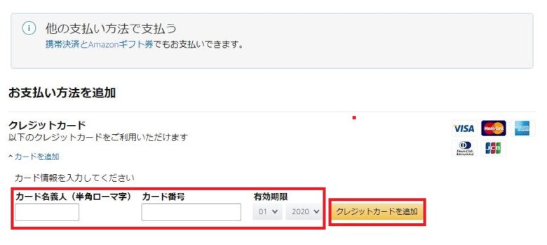 プライム・ビデオの支払いをするクレジットカードを登録をします。