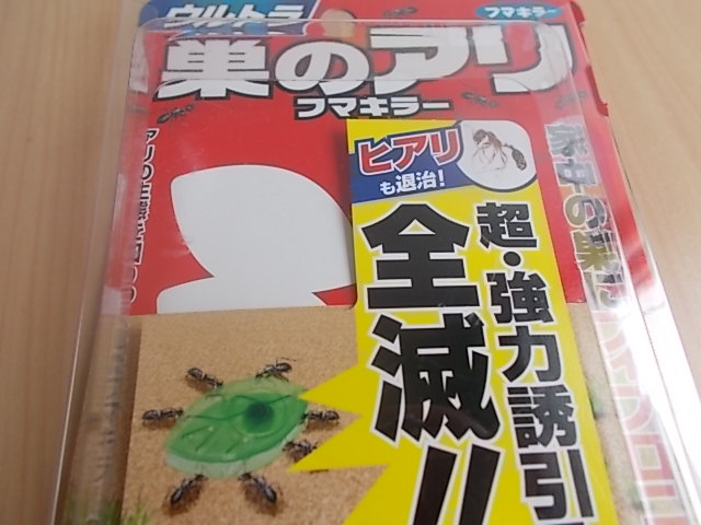 スプレータイプのものは使いたくなかったので、巣に持ち帰るタイプの殺虫剤をドラッグストアで購入。巣のアリフマキラー10個入りです。