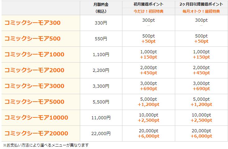 コミックシーモアには主に2つのオトクな料金プランがあります。