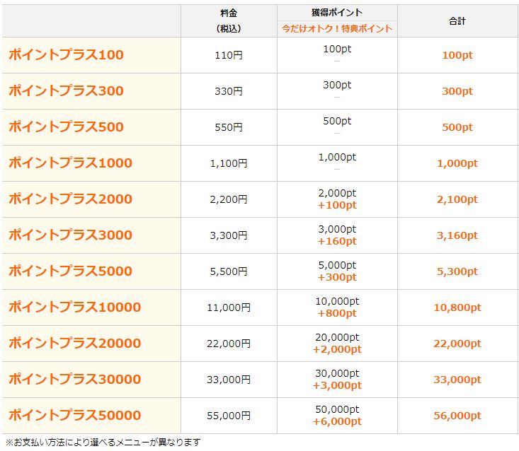 - ポイントプラスコース:好きな時に好きな分だけポイントを購入する。特典ポイントあり