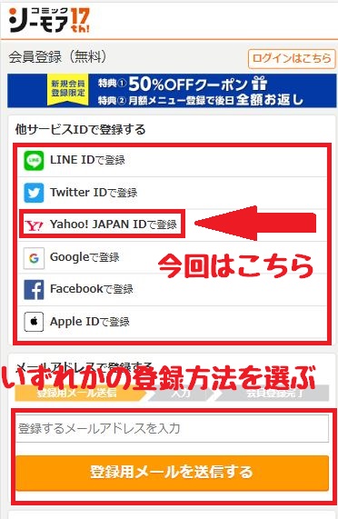 今回私はYahoo!JAPAN IDを使い登録しますが、どの登録方法を選んでもとても簡単です。