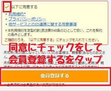「以下に同意する」にチェックを入れ、「会員登録する」をタップします。