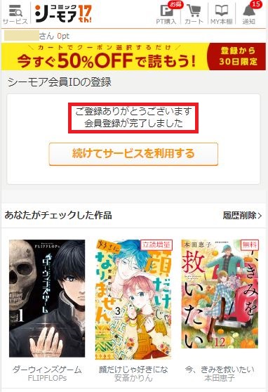 コミックシーモアの登録はとてもかんたんで、2分かからずに済ませることができます。