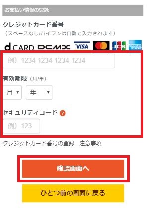 最後にクレジットカード情報を入力して「確認画面」を押します。