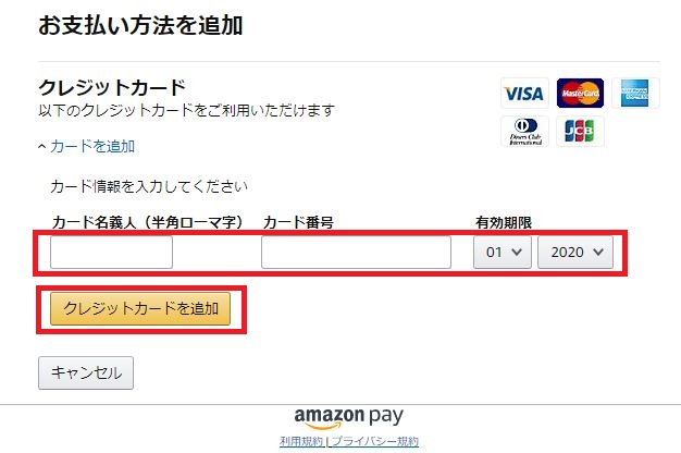 AmazonPayに登録するクレジットカードの情報を入力し、「クレジットカードを追加」をタップ。