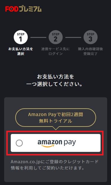 FODPREMIUMをAmazon Pay経由で登録すると初回に限り2週間無料でお試し利用することができます。