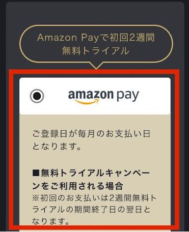 しかもAmazonPay経由(Amazonアカウントを使って)で登録すると、初回に限り2週間無料でお試し利用することができます。