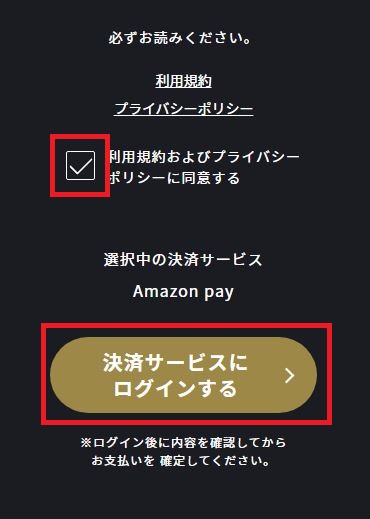 「利用規約及びプライバシーポリシーに同意する」にチェックを入れ、「決済サービスにログインする」をクリック。