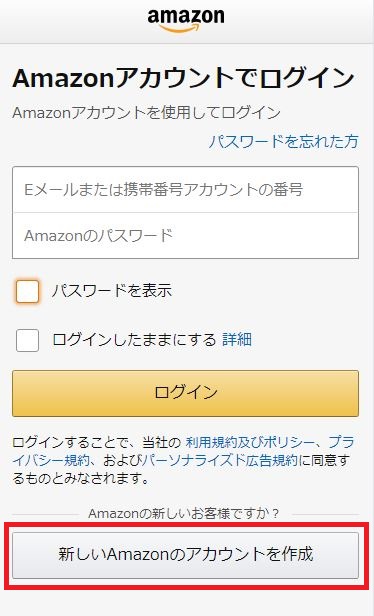 すでにAmazonアカウントをお持ちの方はメールアドレス、パスワードを入力し、ログインしてください。