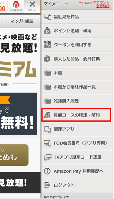 ご自分の無料期間がいつまでか知りたい方は、マイメニューの「月額コースの確認・解約」をクリックすると確認することができます。