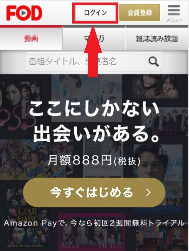 FODPREMIUMのトップページにアクセスしたら「ログイン」ボタンを押します。