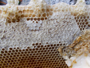 羽で扇いで水分を飛ばし、蜜の濃度を上げていきます。すると蜜に蓋がかかり、高い濃度の熟成したはちみつになります。