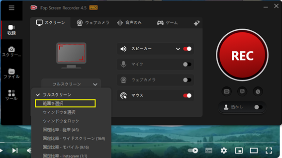 録画範囲を選択したら、「REC」ボタンをクリックするだけで録画が始まります。