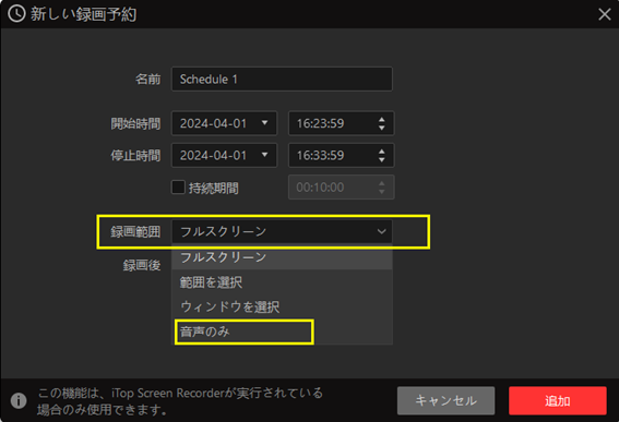 自分の都合でに気になるアニメを見逃すことがありますよね。そんな残念な事態を避けるために、「iTop Screen Recorder」には予約録画/録音機能が搭載されています。