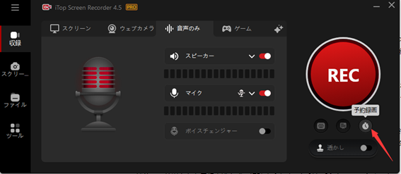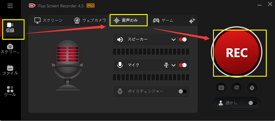 使い方は録画機能でほぼ同じです。収録モードは「音声のみ」モードを選択し、「REC」ボタンをクリックするだけです。