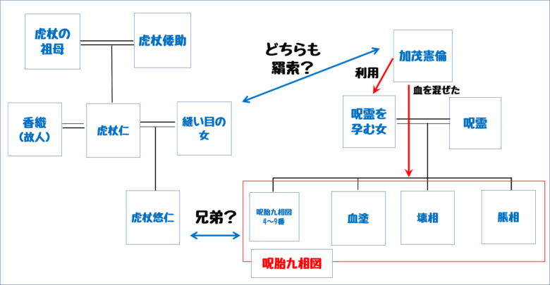 この図を元に虎杖と九相図の関係を考えると、虎杖は呪胎九相図の一部ではありませんが、呪胎九相図とは義兄弟の関係だと考えられます。