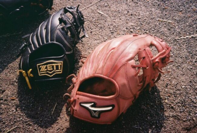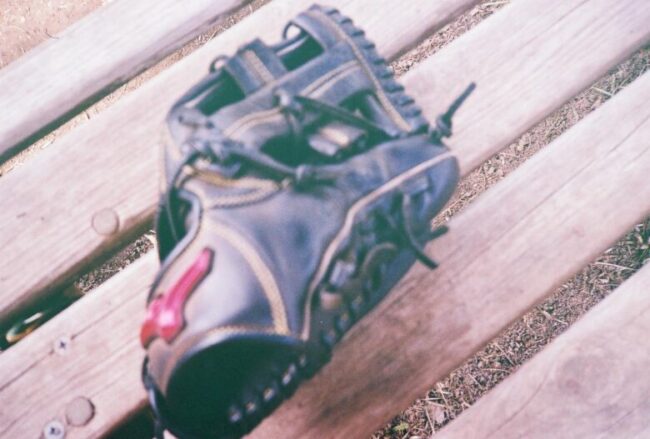 子どもたちにお願いして、グローブの写真も撮らせてもらいましたが、グローブではなく、地面にピントが合っています。