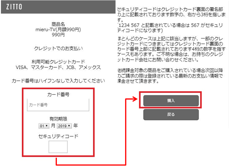 クレジットカード払いを選んだ方はカード情報を入力して「購入」をクリック。