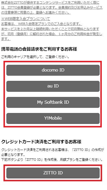 私は今回カード払いを選ぶので、下の「ZITTO ID」をタップして先に進みます。