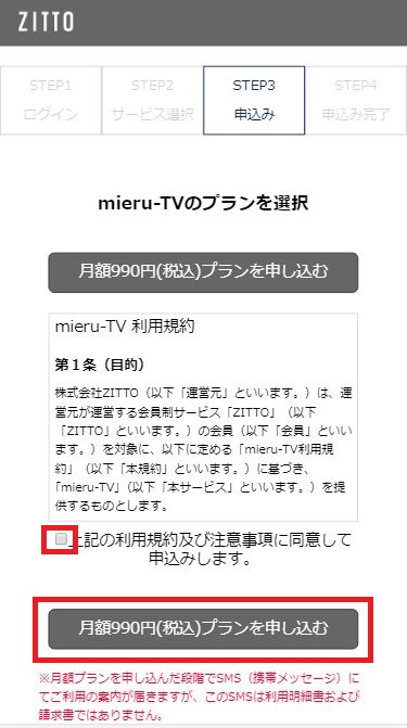 プラン申込画面に移るので、規約・注意事項に同意するをチェックして、「月額990円プランを申し込む」をタップします。