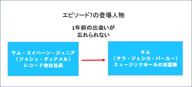 - サム・エイハーン・ジュニア (ジョシュ・デュアメル):レコード会社社長。前年の大晦日で会ったキムのことが忘れられず、1年後約束の場所に行く。
