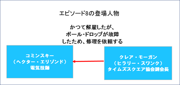 - コミンスキー(ヘクター・エリゾンド):電気技師。クレアに首にされた過去が。ボール・ドロップイベントの危機を救う。