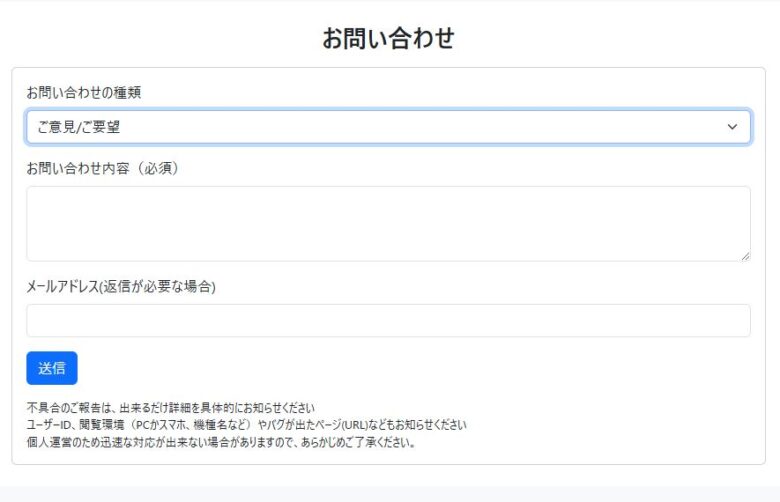 蛇足ですが、問合せからはOne Line Diaryの運営者に不具合報告、ご意見・ご要望などを送ることが可能。