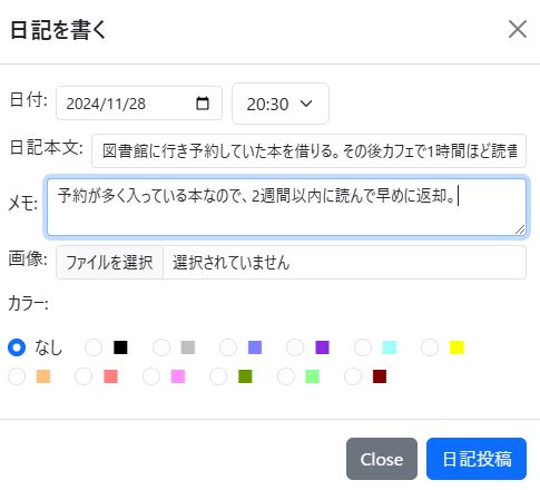 とてもシンプルな画面なので、直感的に日記を書くことができそうですね。